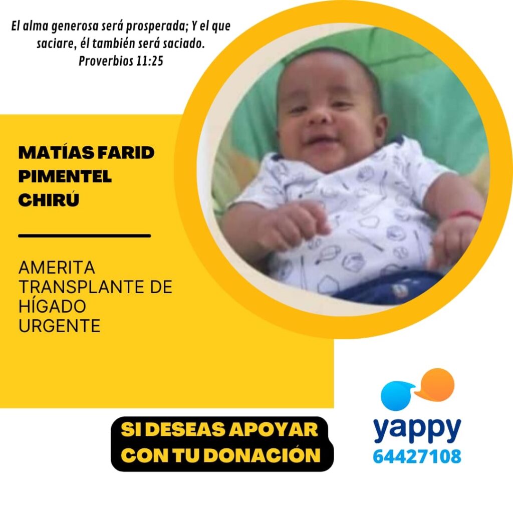 Hace un poco más de seis meses la familia Pimentel Chirú, vió bendecidas sus vidas con la llegada de sus gemelos Matías y Mateo, son la luz de los ojos de Katia, su madre y la ilusión de su padre Luis Carlos, quienes con mucha emoción y amor recibieron a sus hijos, lamentablemente hoy ven en peligro la vida de Matías quien necesita urgente un trasplante de hígado.
