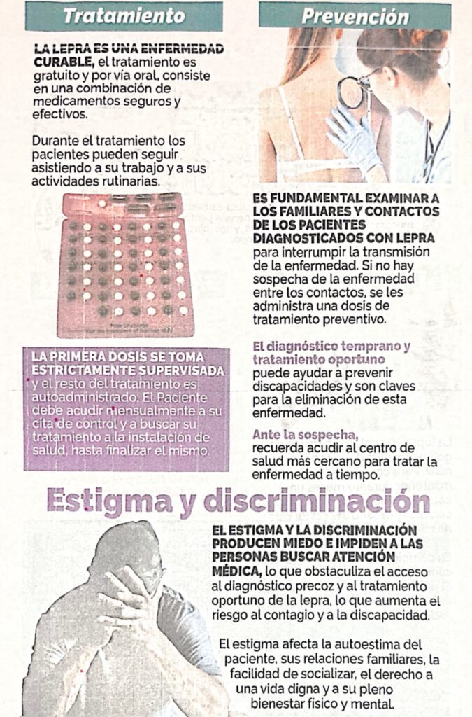 El trabajo que se mantienen las instancias médicas consiste en la evaluación de los casos, atención y retención de la enfermedad, fomentando el respeto y discreción con los pacientes. El contagio de la lepra se da en un tiempo prolongado, por lo que casi siempre la infección de esta bacteria se da entre familiares, a través del aire.