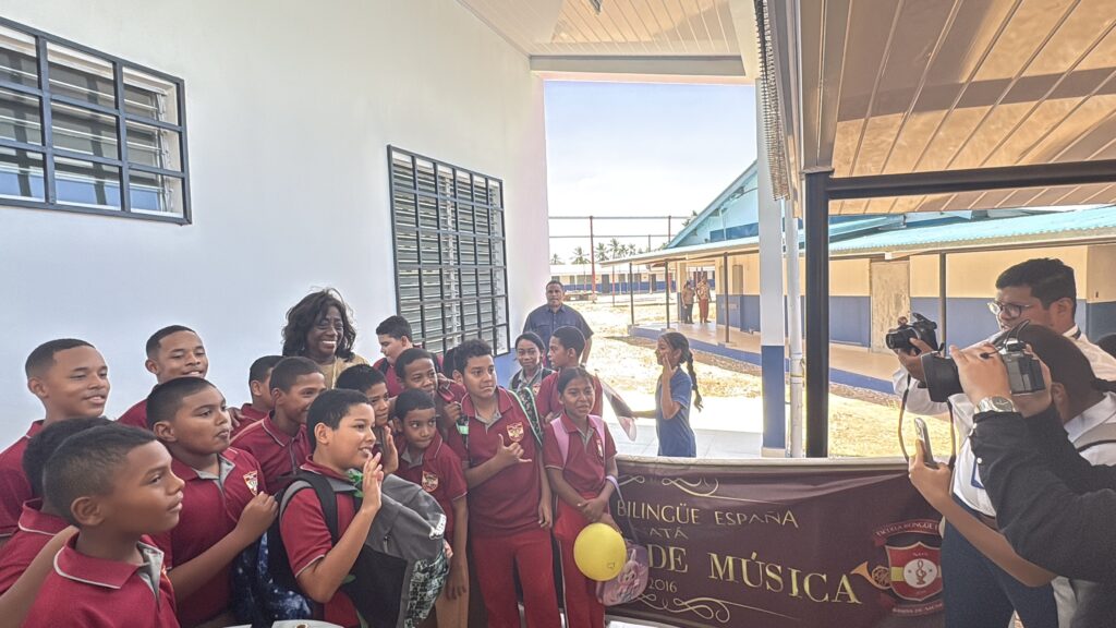 La ministra llegó primero a la escuela Mariano Prados Araúz, donde esperaron por el proyecto unos 6 años con un valor superior a los 4.5 millones de balboas, por lo que ahora reciben un nuevo edificio de administración, remodelación de pabellones, y unas 30 cámaras de seguridad.