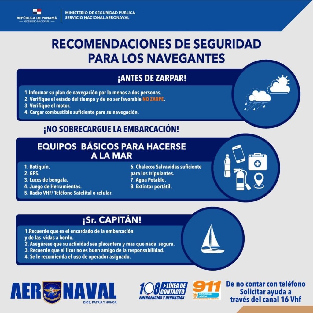 El Sistema Nacional Aeronaval recalca sus recomendaciones en temas de seguridad marítima a los pescadores y miembros de embarcaciones en general para que puedan enfrentarse a cualquier contratiempo en el mar, como llevar chalecos y aros salvavidas, provisiones, extintor y mantener líneas de emergencia como el 108.